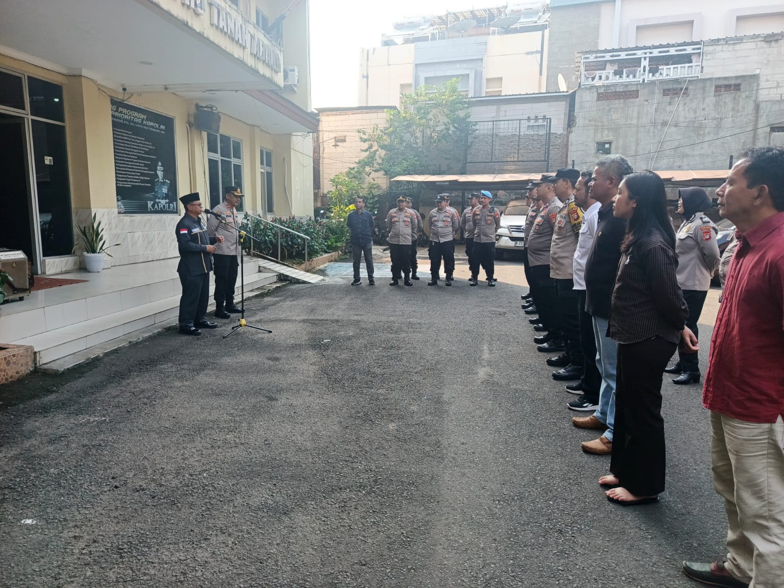 Jakarta Pusat — Aparat Kepolisian dari Polsek Cempaka Putih menggelar Apel Pelayanan dalam rangka pengamanan aksi unjuk rasa yang dilakukan oleh LSM Fijar Keadilan Demokrasi di Kantor Bawas MA RI, Jalan Jenderal Ahmad Yani, Cempaka Putih, Selasa (21/4/2026).