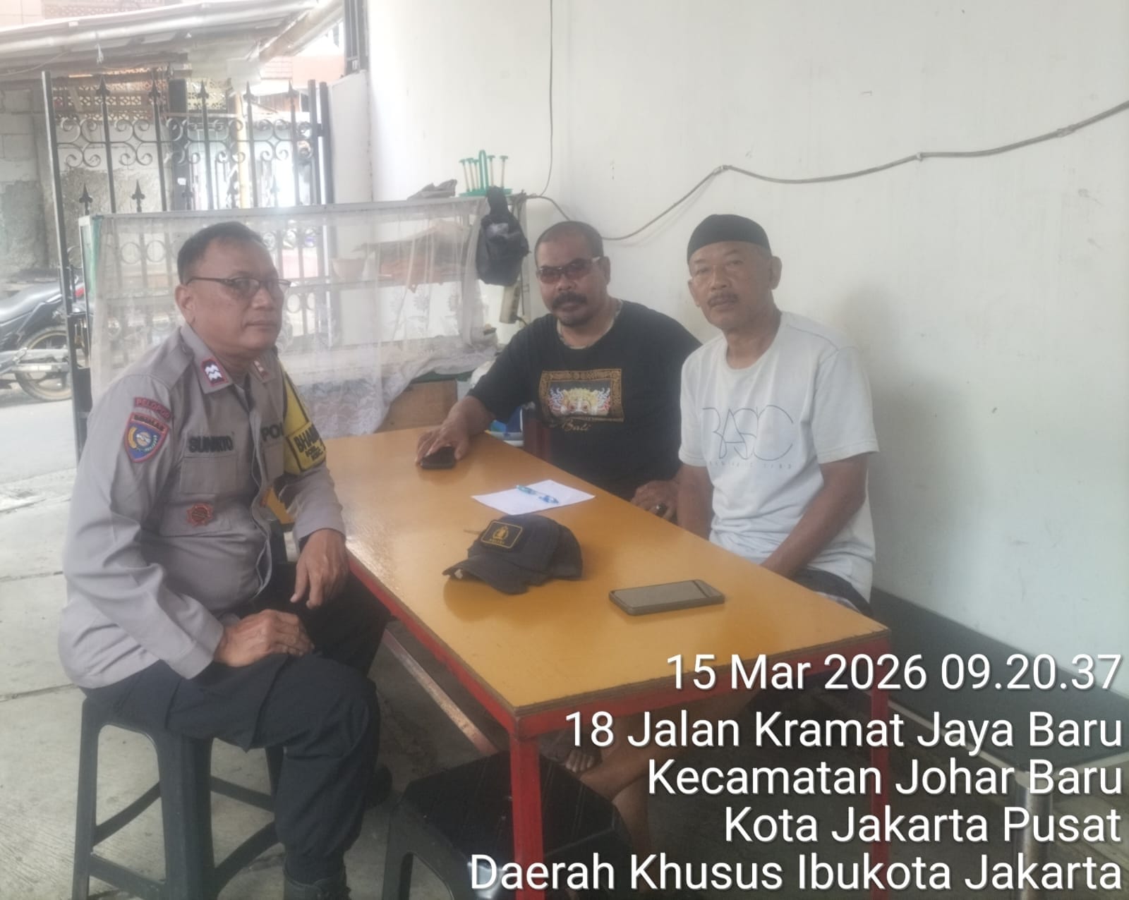 Kegiatan tersebut dilaksanakan pada Minggu (15/3/2026) pukul 11.30 WIB di Jalan Kramat Jaya Baru IV RW 08, Kelurahan Johar Baru, Kecamatan Johar Baru, Jakarta Pusat. Dalam kegiatan itu, Bhabinkamtibmas Kelurahan Johar Baru Aiptu Sunarto menyambangi warga sekaligus tokoh masyarakat setempat, Heriyanto dan Darmoadji.