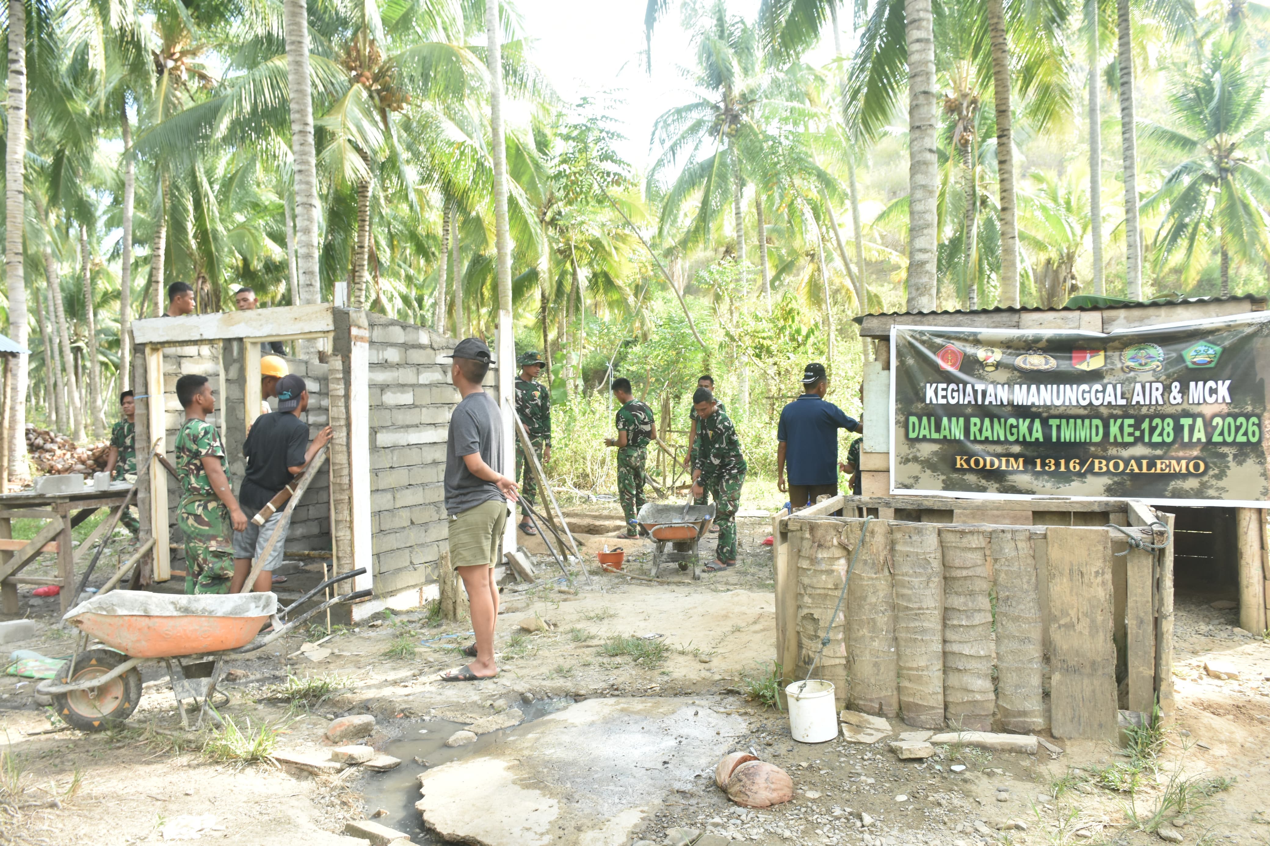 BOALEMO – Semangat pengabdian personel Satgas TNI Manunggal Membangun Desa (TMMD) ke-128 Kodim 1316/Boalemo seolah tak kenal lelah. Memasuki hari-hari krusial pelaksanaan program, progres pembangunan fasilitas Mandi, Cuci, Kakus (MCK) Umum di Desa Hutamonu, Kecamatan Botumoito, kini mulai menunjukkan wajah aslinya.