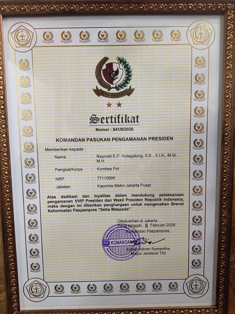 Jakarta Pusat – Kapolres Metro Jakarta Pusat Kombes Pol Dr Reynold E.P Hutagalung menerima penganugerahan penyematan Brevet Kehormatan “Setia Waspada” dari Pasukan Pengamanan Presiden (Paspampres). Kegiatan berlangsung di Ruang Bhuana Agung, Mako Paspampres, Rabu (11/2/2026) pukul 09.00 WIB.