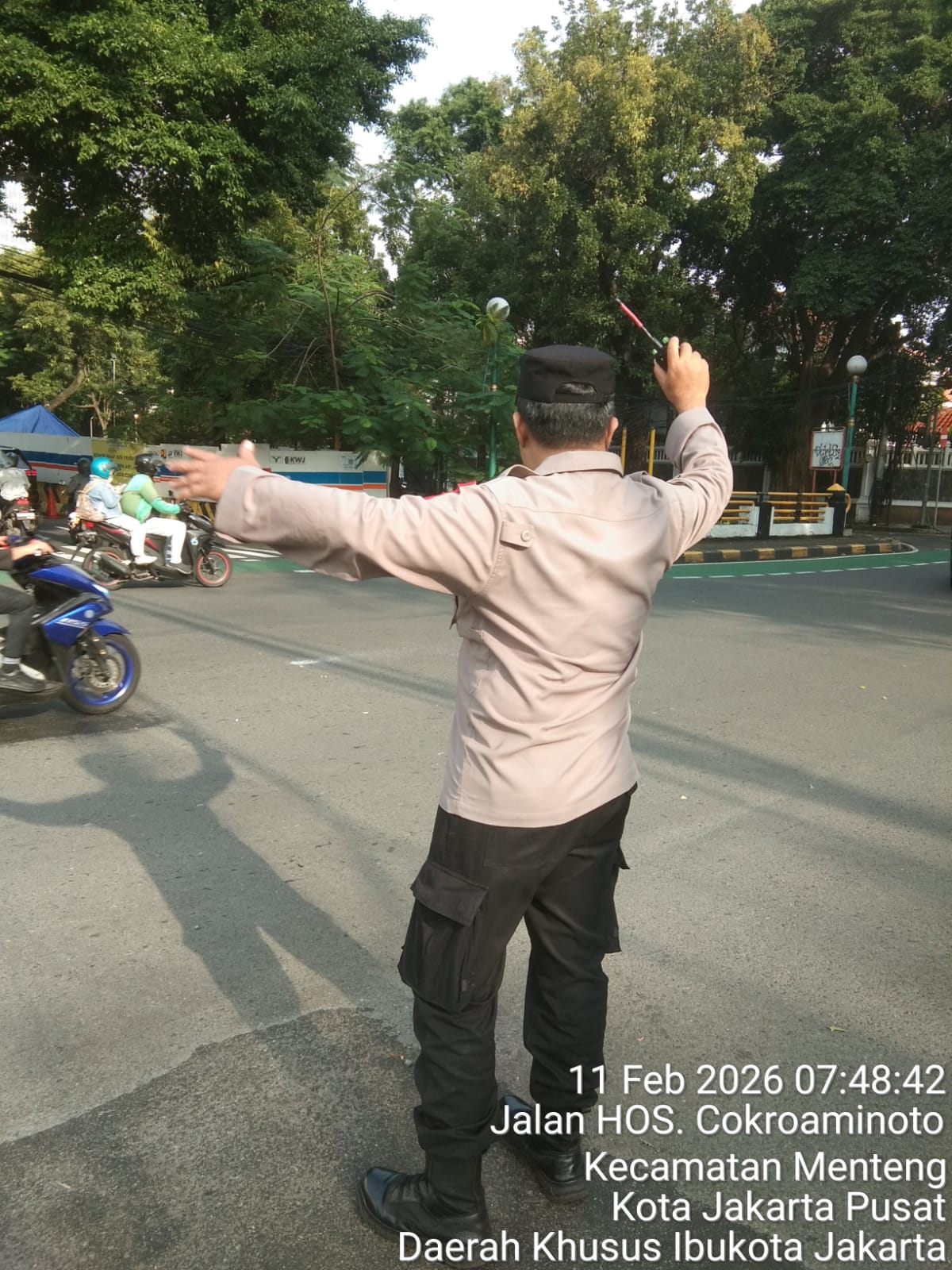 Jakarta Pusat – Aktivitas masyarakat di wilayah Menteng, Jakarta Pusat, pada pagi hari terpantau berjalan lancar berkat kehadiran Kapolsubsektor Cut Mutia Aiptu Ali Imran yang melaksanakan pengaturan arus lalu lintas di persimpangan Traffic Light (TL) Jalan Cokroaminoto, Menteng. Pengaturan ini dilakukan untuk mengantisipasi meningkatnya volume kendaraan seiring aktivitas siswa masuk sekolah, karyawan menuju kantor, serta masyarakat yang mulai beraktivitas. Rabu (11/2/2026)