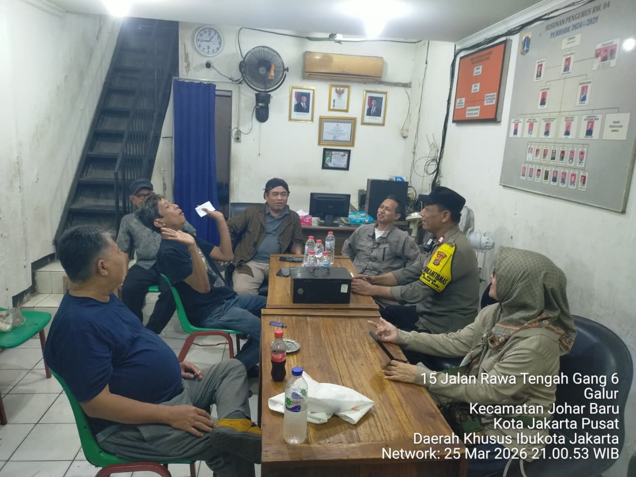 Jakarta Pusat – Dalam upaya menjaga situasi keamanan dan ketertiban masyarakat tetap kondusif, Bhabinkamtibmas Kelurahan Galur Aiptu Baktiar melaksanakan kegiatan sambang dan halal bihalal bersama Ketua RW 04 dan para Ketua RT di wilayah Kelurahan Galur, Kecamatan Johar Baru, Rabu (25/3/2026) malam.