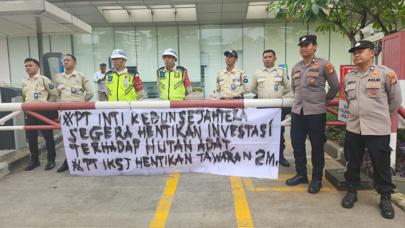 Selain orasi, massa juga membawa spanduk bertuliskan, “PT Inti Kebun Sejahtera Segera Hentikan Investasi terhadap Hutan Adat” serta “#PTIKSJ Hentikan Tawaran 2M” sebagai bentuk penegasan tuntutan mereka kepada pihak perusahaan.