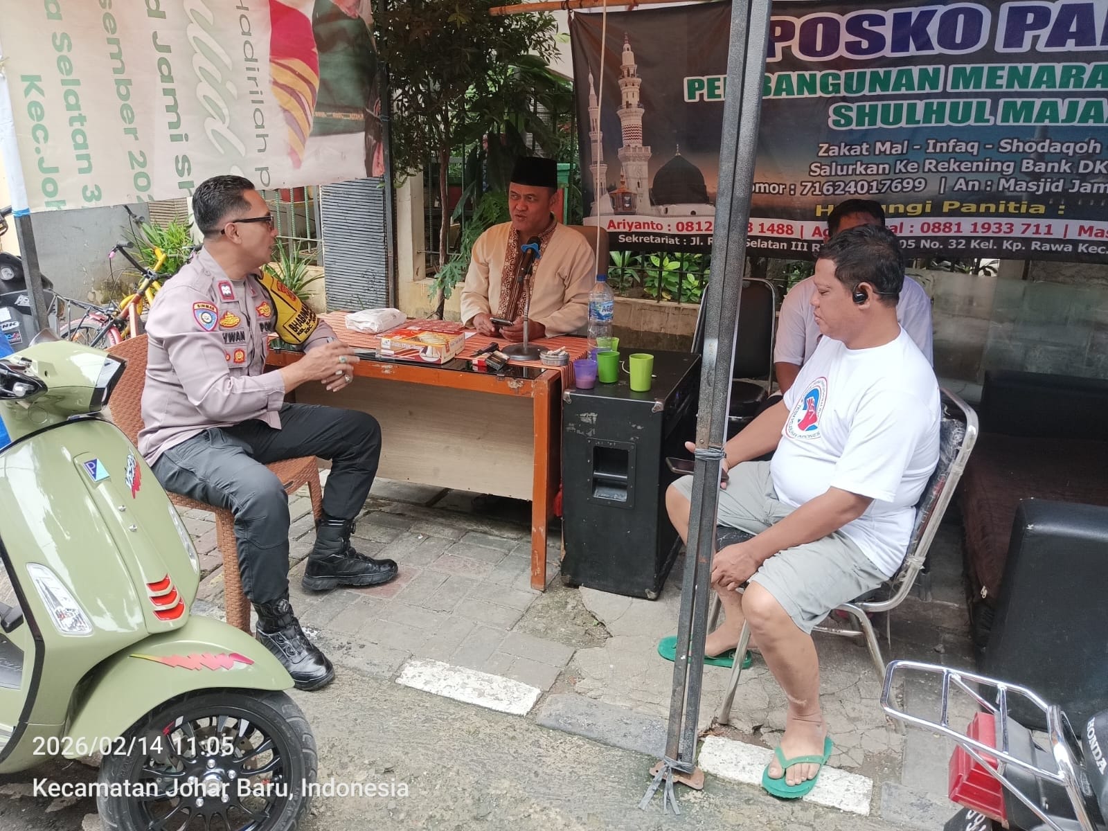Kegiatan berlangsung di Posko Panitia Masjid Shulhul Majaami, Jalan Rawa Selatan 3. Bhabinkamtibmas Kelurahan Kampung Rawa Aiptu Ikhwan bertemu dengan Pak Abu selaku DKM Masjid Shulhul Majaami serta Pak Zulkifli selaku Ketua RT.