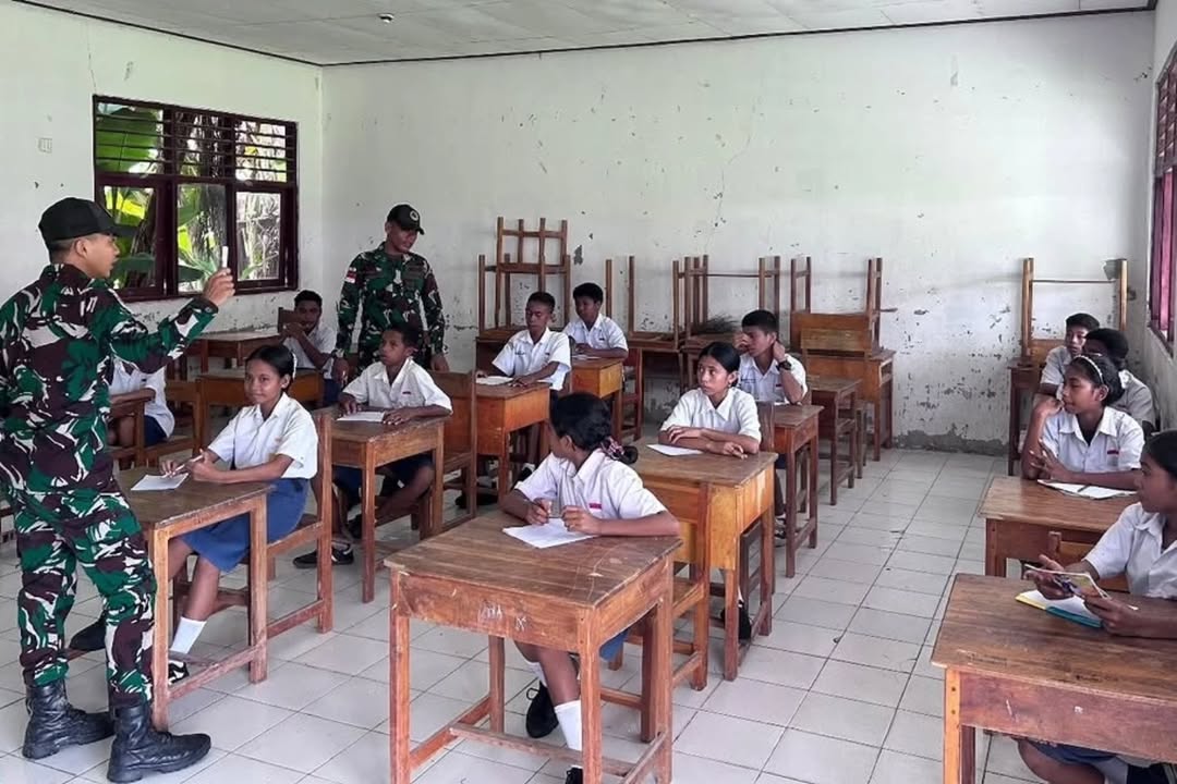 Malaka – Satgas Pamtas RI–RDTL Sektor Timur Yonarmed 12 Kostrad melalui Gadik Pos Haslot memberikan pembekalan wawasan kebangsaan kepada pelajar SMP Negeri Metamauk, Desa Alas Selatan, Kecamatan Kobalima Timur, Kabupaten Malaka, Jumat (10/04/2026).